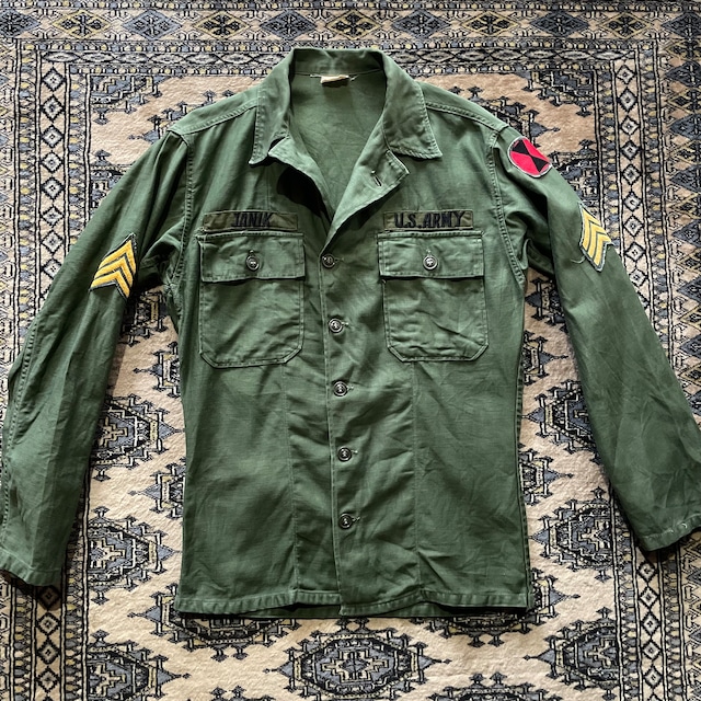 60s U.S.ARMY OG107cotton sateenshirts 2nd 60s〜2ndタイプのOG107 cotton sateenshirts ネームタグは取れてありません。 筒袖 サイズ タグ無 Sぐらいです。 肩幅約42cm 身幅約48cm 丈約74cm 袖丈約58cm