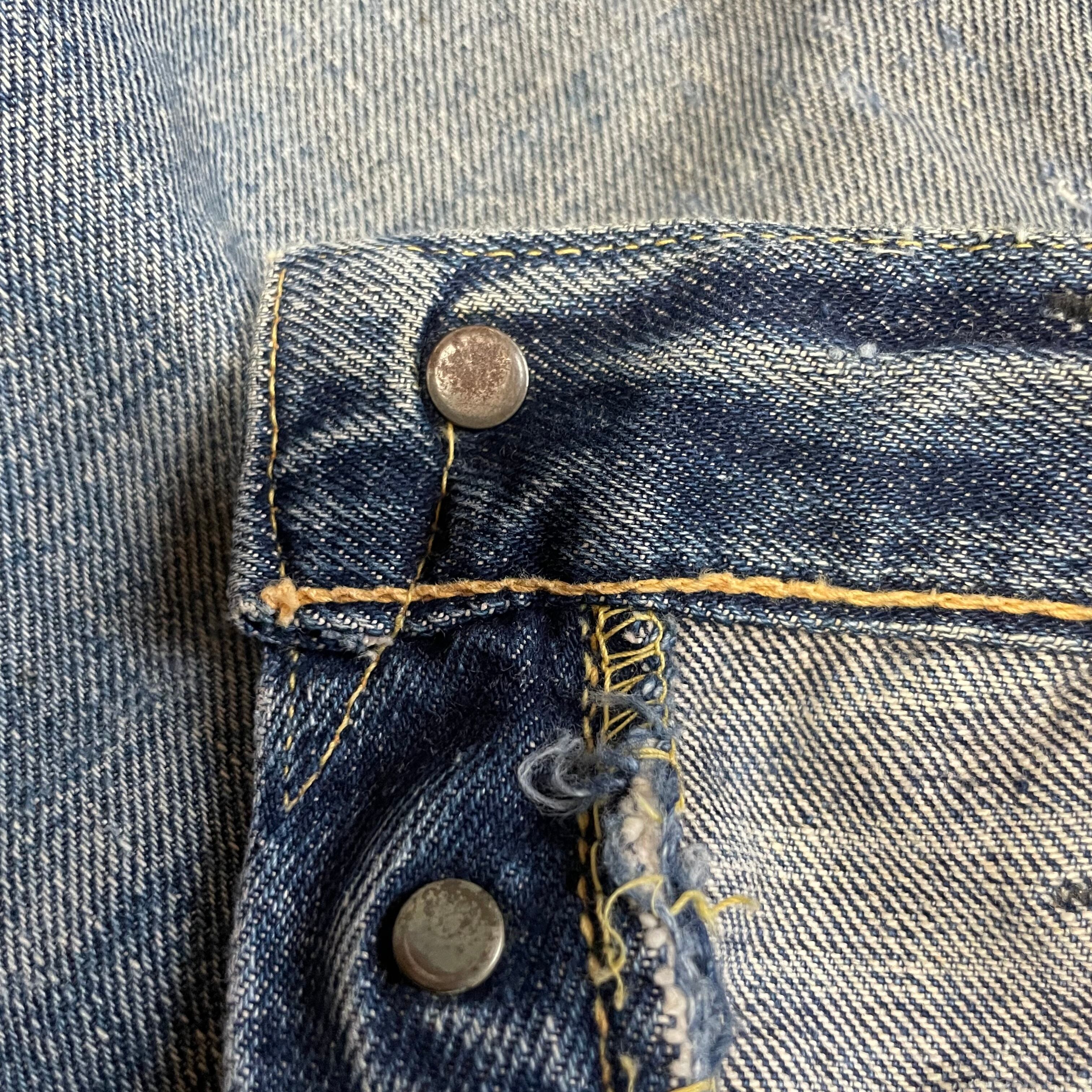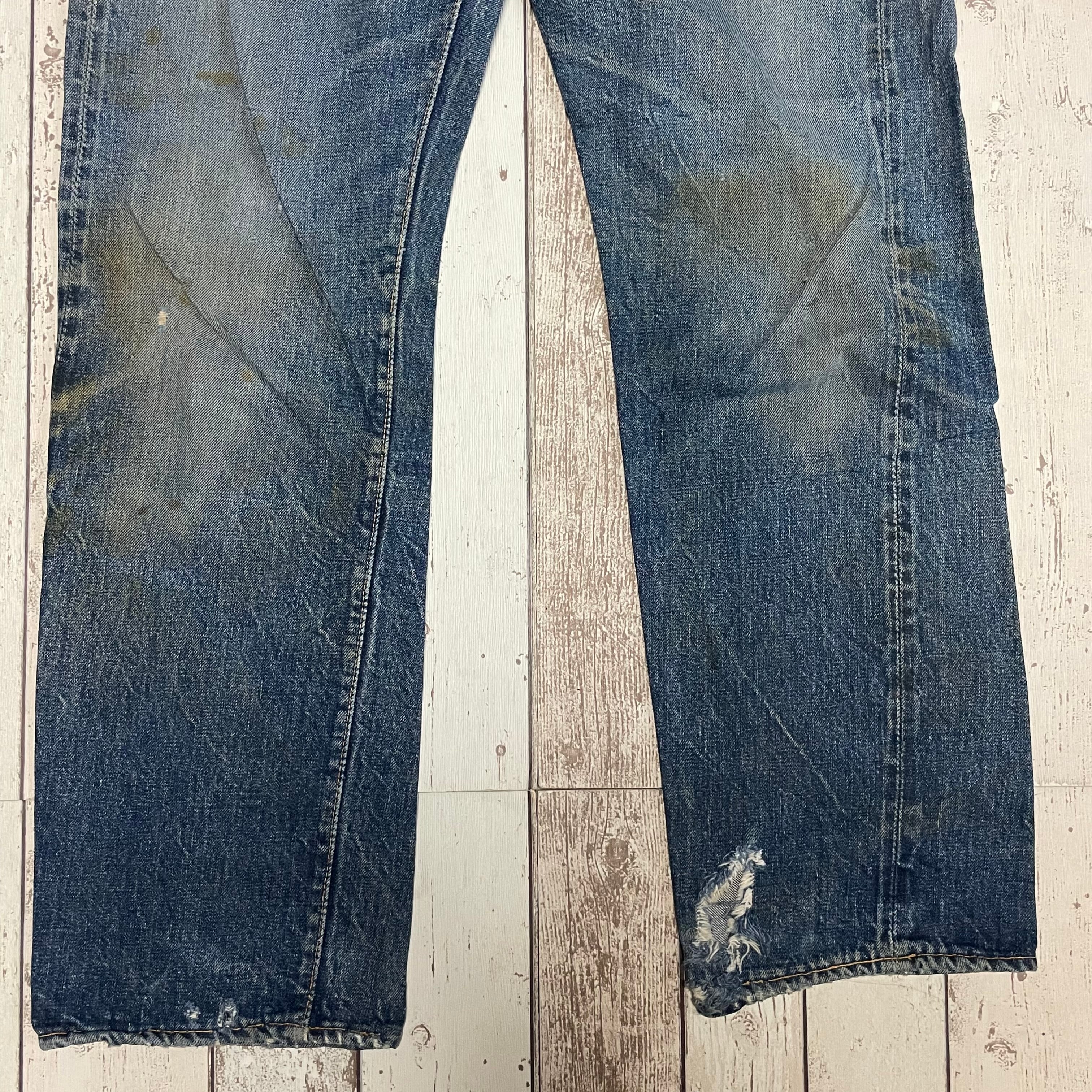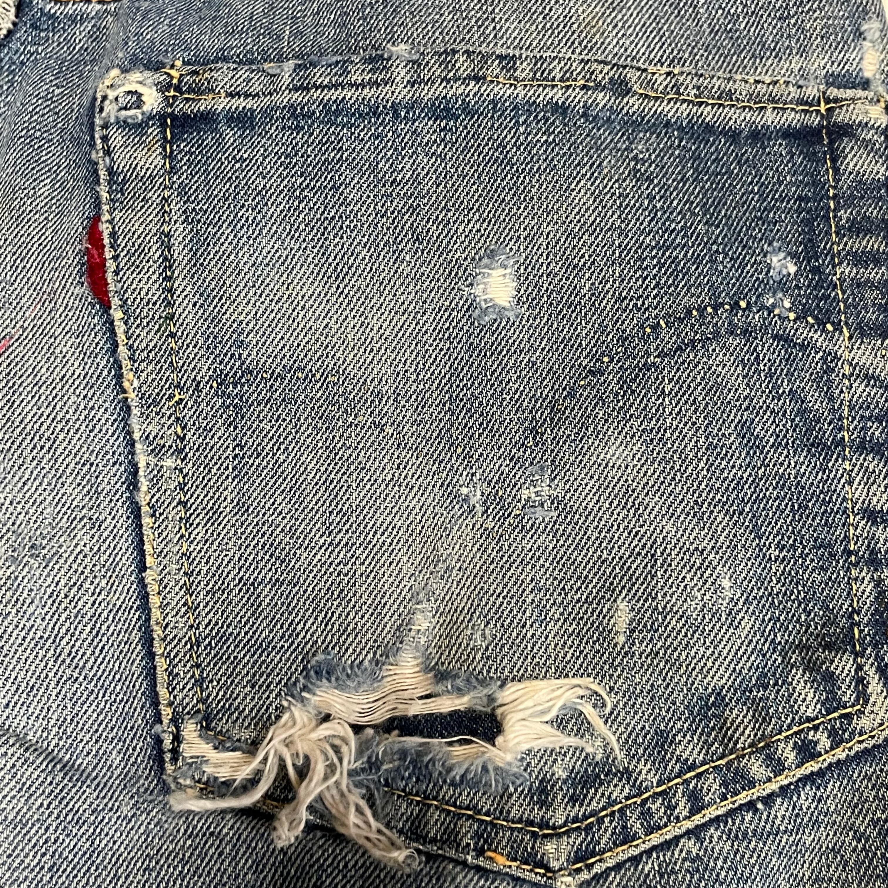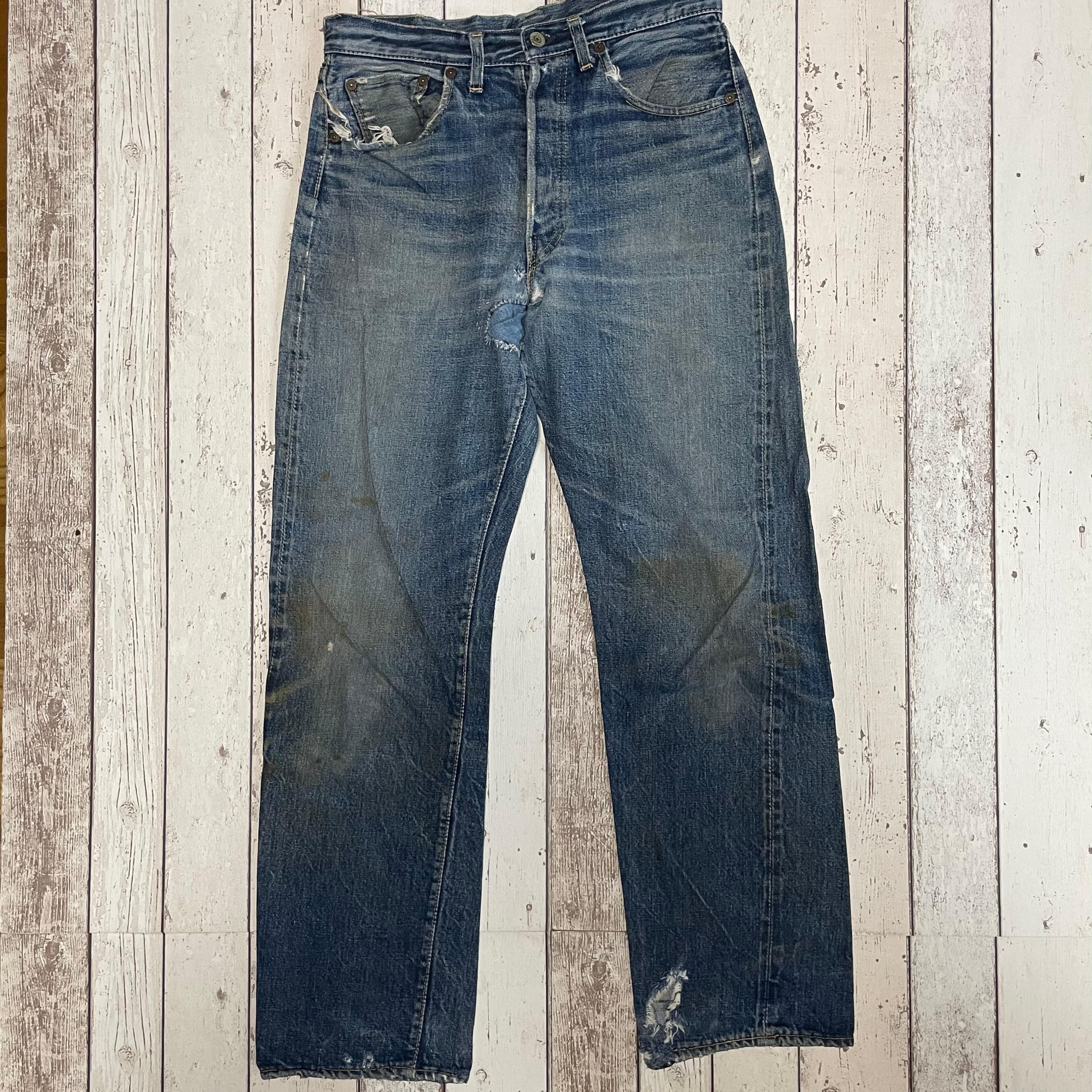 50's〜のlevis 501xxです。紙パッチほとんど取れてます。タブも読めません。フロントVステッチ、コインポケット裏耳付き、オフセットセンターループ、股下リペア、破れあり、裾も破れがあります。