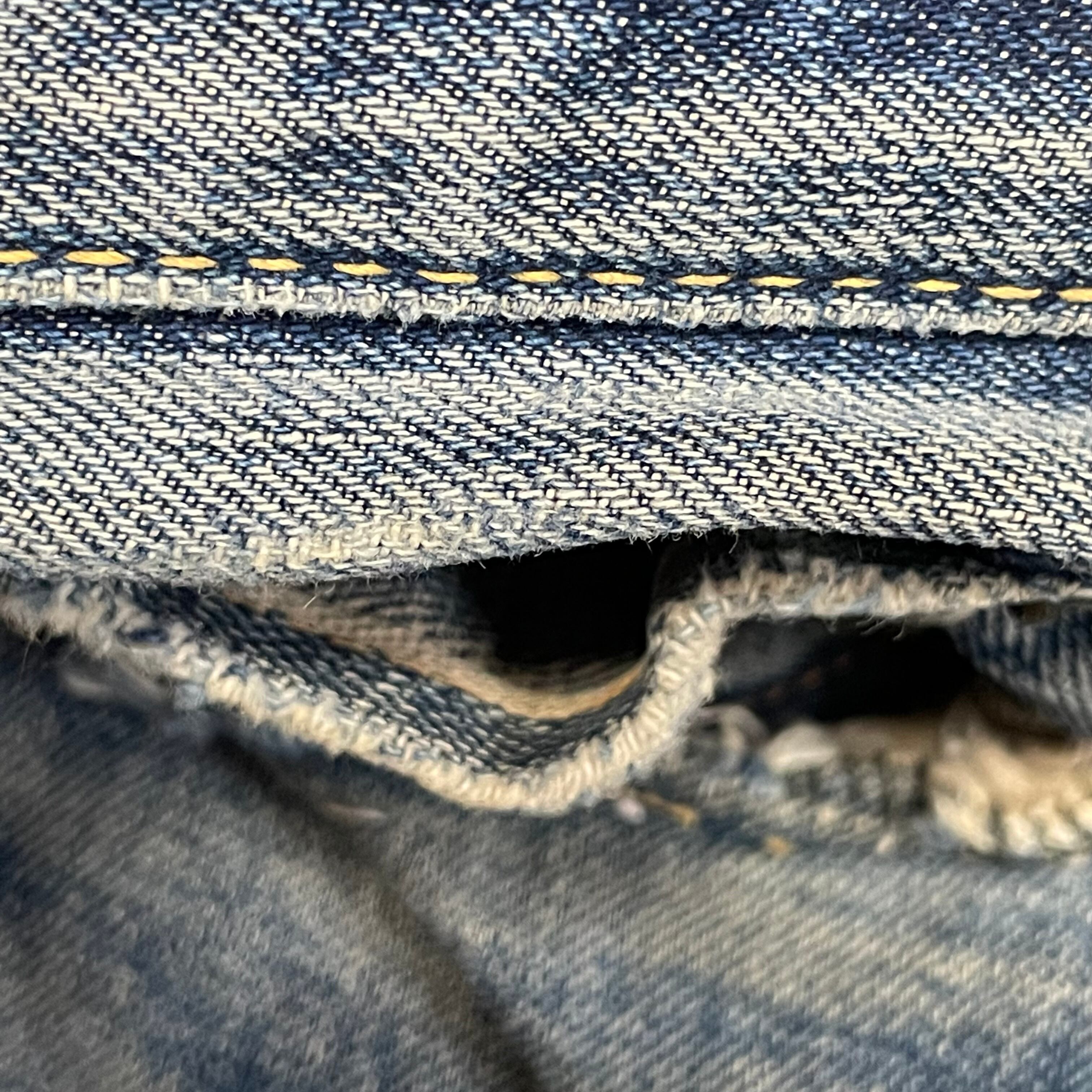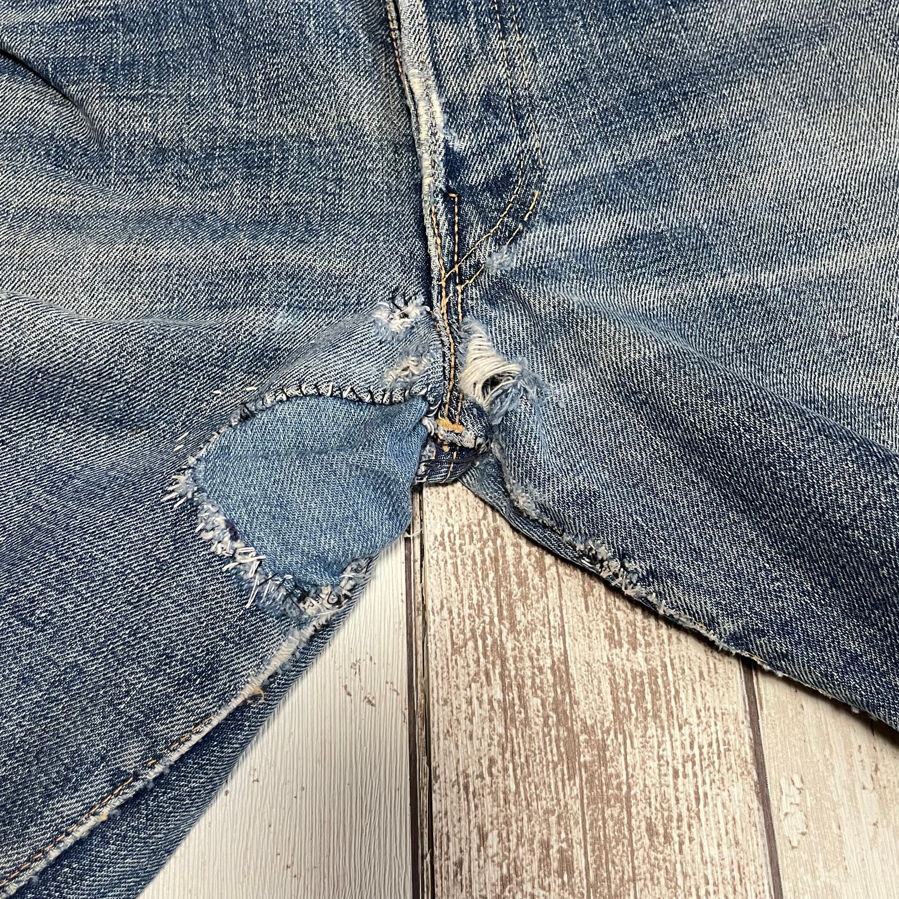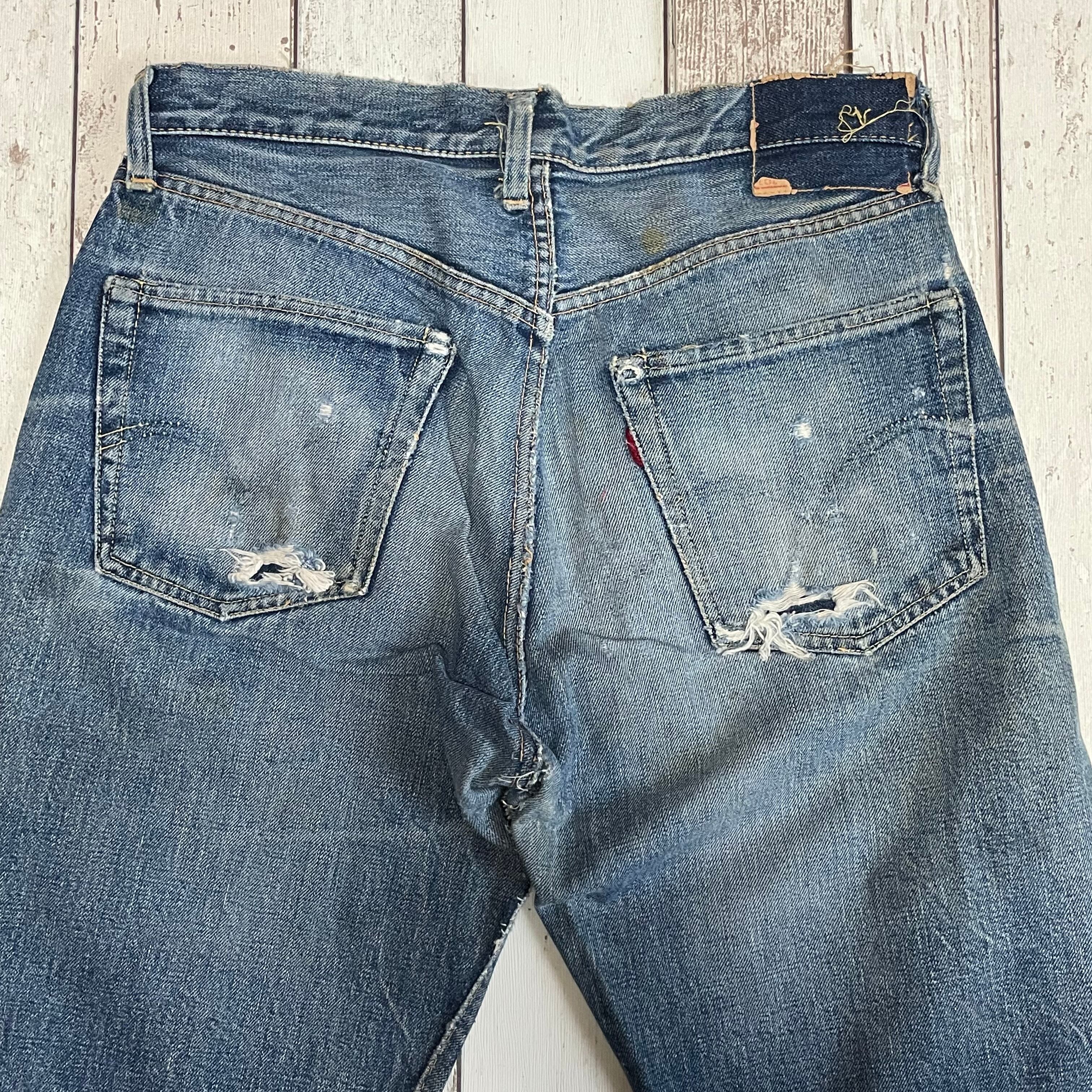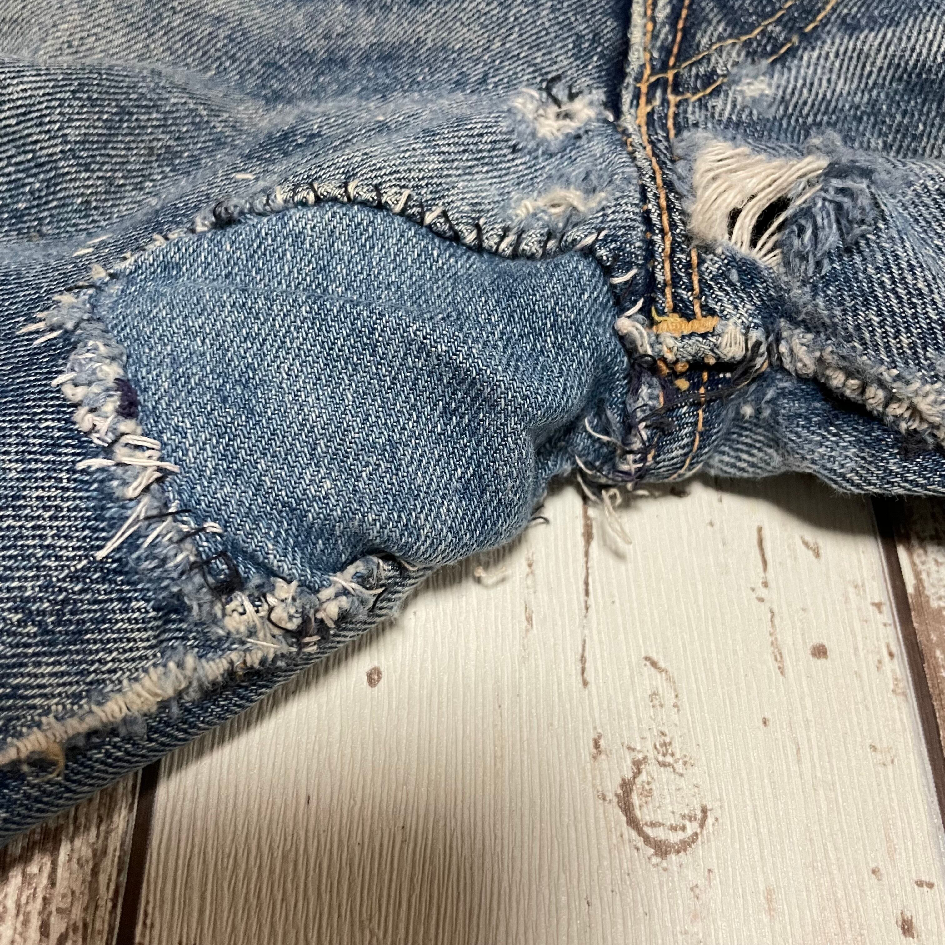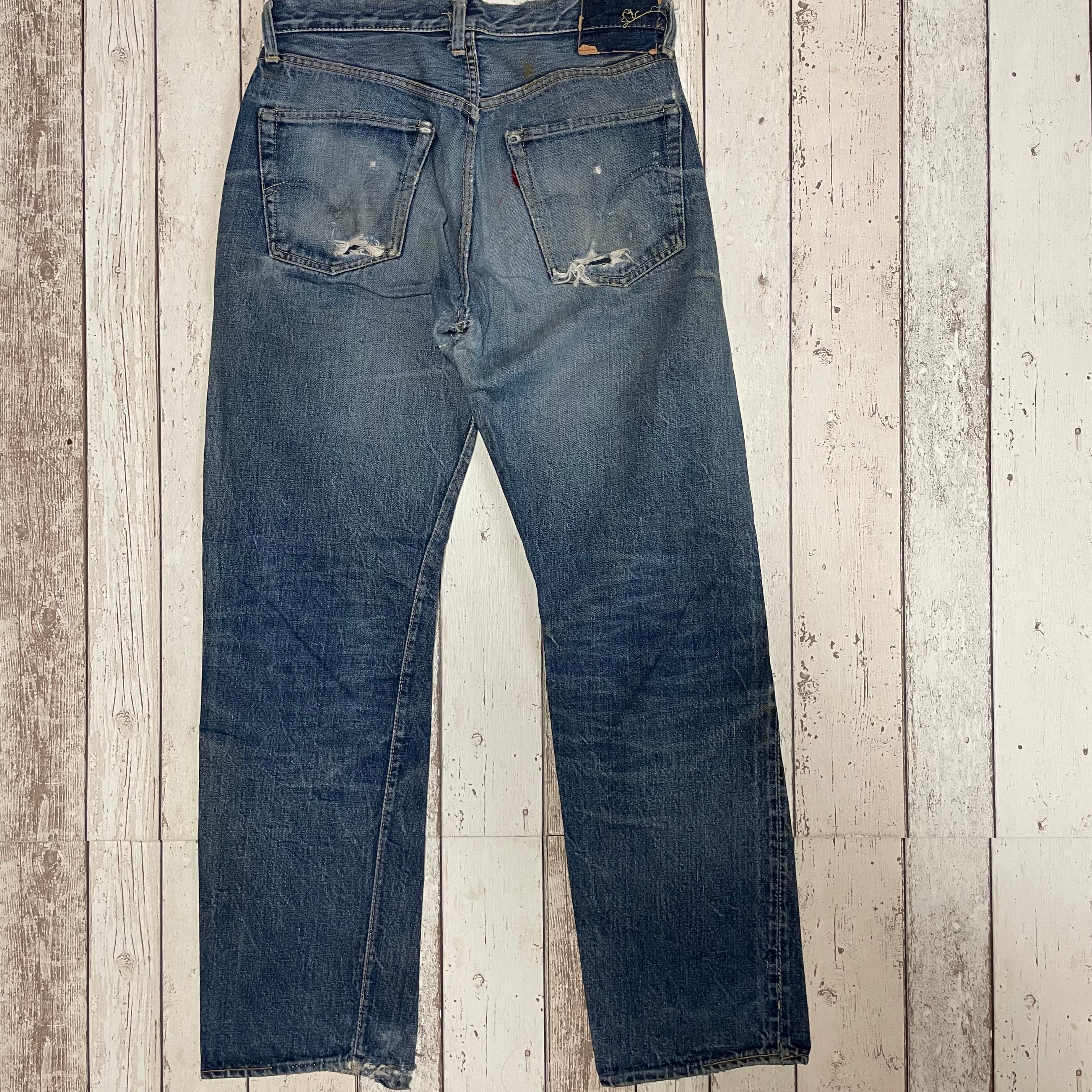 50's〜のlevis 501xxです。紙パッチほとんど取れてます。タブも読めません。フロントVステッチ、コインポケット裏耳付き、オフセットセンターループ、股下リペア、破れあり、裾も破れがあります。